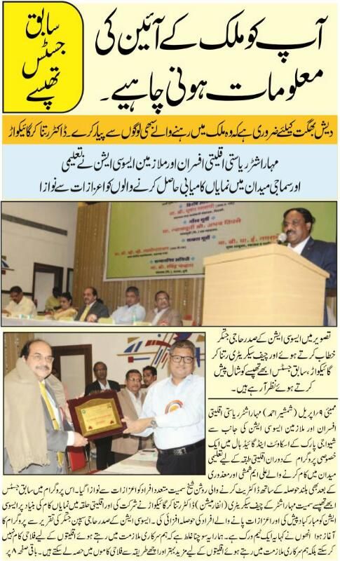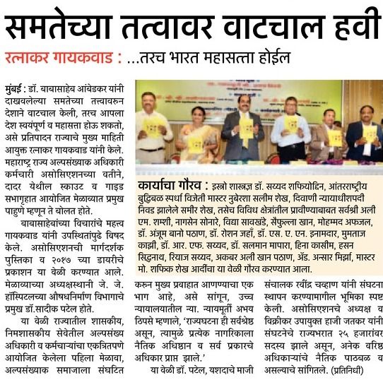 असोसिएशनचे अध्यक्ष श्री. हाजी जतकर, विक्रीकर उपायुक्त यांनी भारतरत्न डॉ. बाबासाहेब आंबेडकर यांच्या ‘शिका, संघटीत व्हा व संघर्ष करा’ या आदर्श विचारसरणीवर असोसिएशनची स्थापना झाल्याचे सांगून मा. श्री. रत्नाकर गायकवाड यांची प्रेरणा, मा. न्यायमूर्ती अभय ठिपसे यांचा आधारस्तंभ पाठींबा मिळत असून शासन प्रशासनातील अनेक वरिष्ठ अधिकाऱ्यांचे नैतिक पाठबळ व मार्गदर्शन मिळत असल्यामुळेच संपूर्ण महाराष्ट्रात सदर असोसिएशनचे काम चालू असल्याचे सांगताना अल्पसंख्यांक समाजाला राष्ट्राचा मुख्य प्रवाहात आणण्याची प्रक्रिया शासनाच्या पाठबळाने संपूर्ण महाराष्ट्रात असोसिएशनच्या माध्यमातून सुरु झाल्याचे सांगितले.